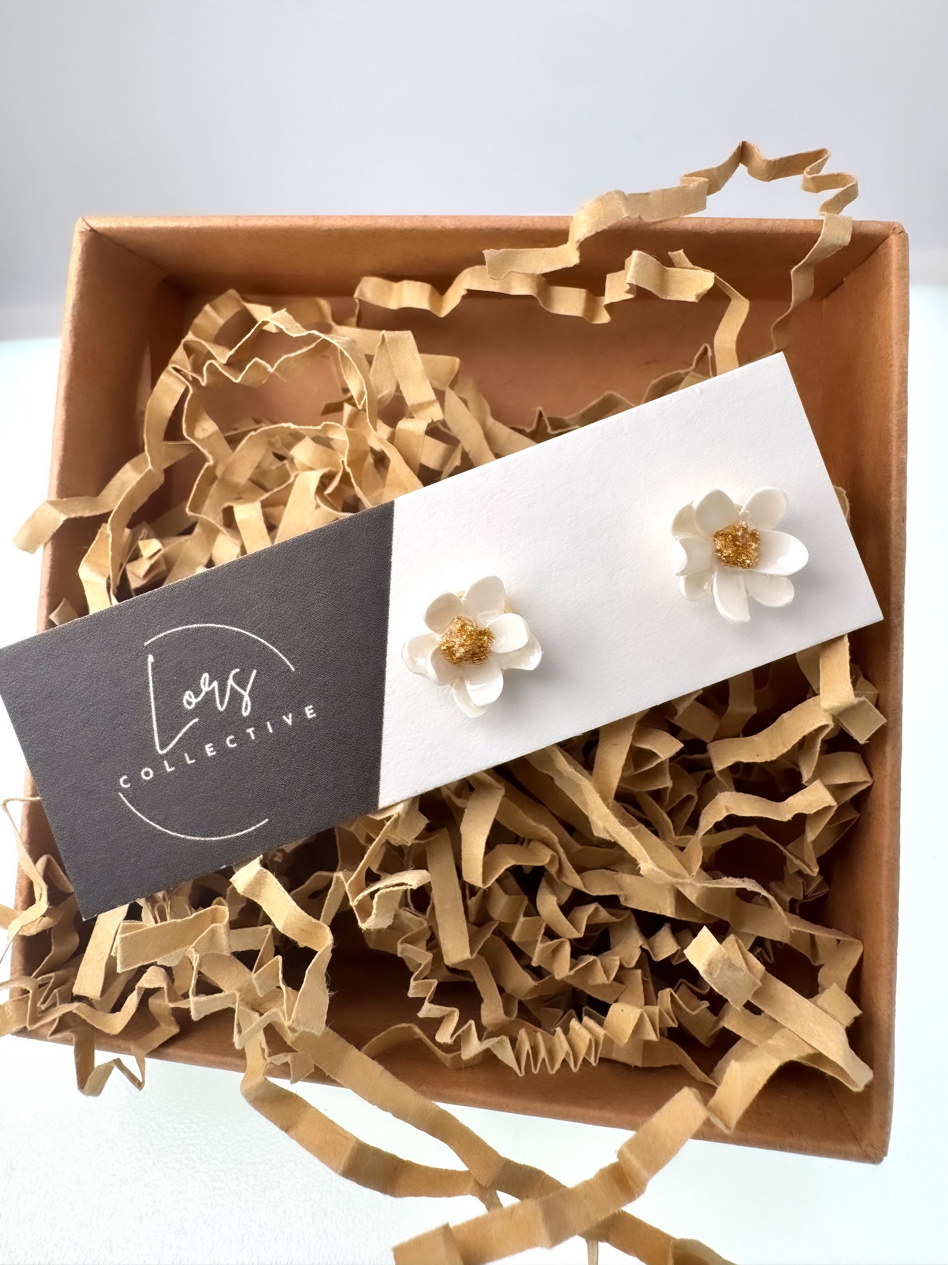 These delicate floral stud earrings are crafted from clay and finished with a gold foil center — the perfect blend of elegant and handmade charm. Each flower is shaped and set by hand, making every pair one-of-a-kind.