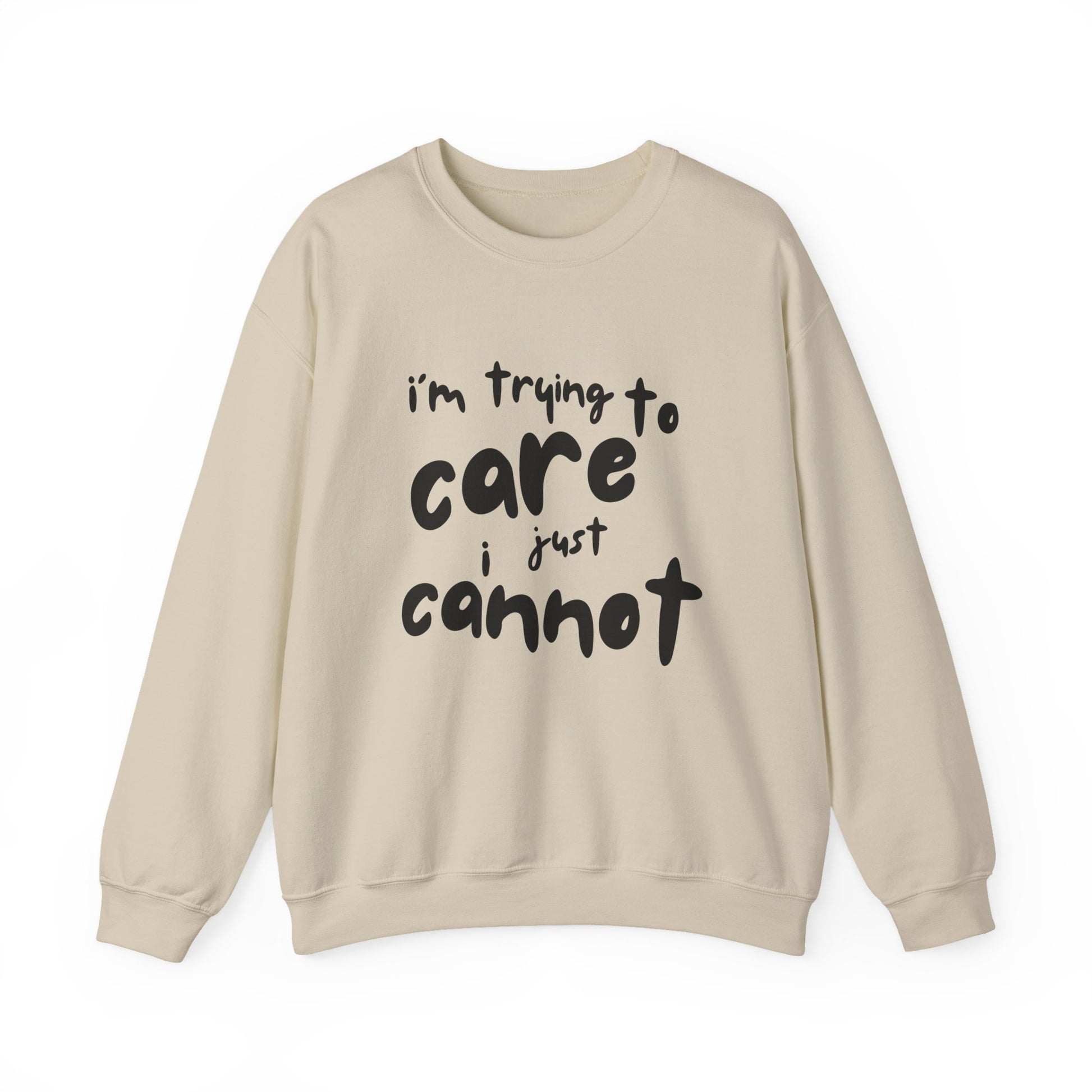 Iconic Printed Sweatshirt: "I'm trying to care, I just cannot"